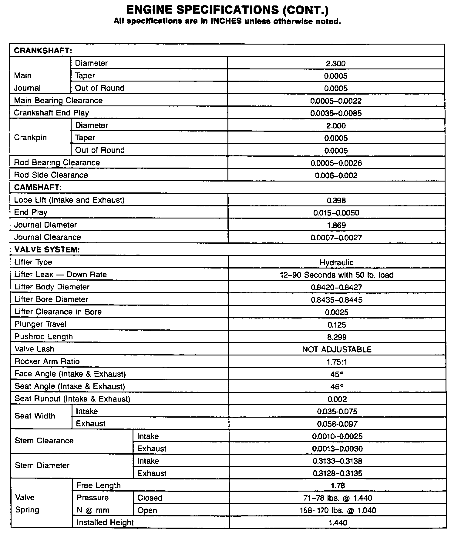 Continued Engine Specifications: