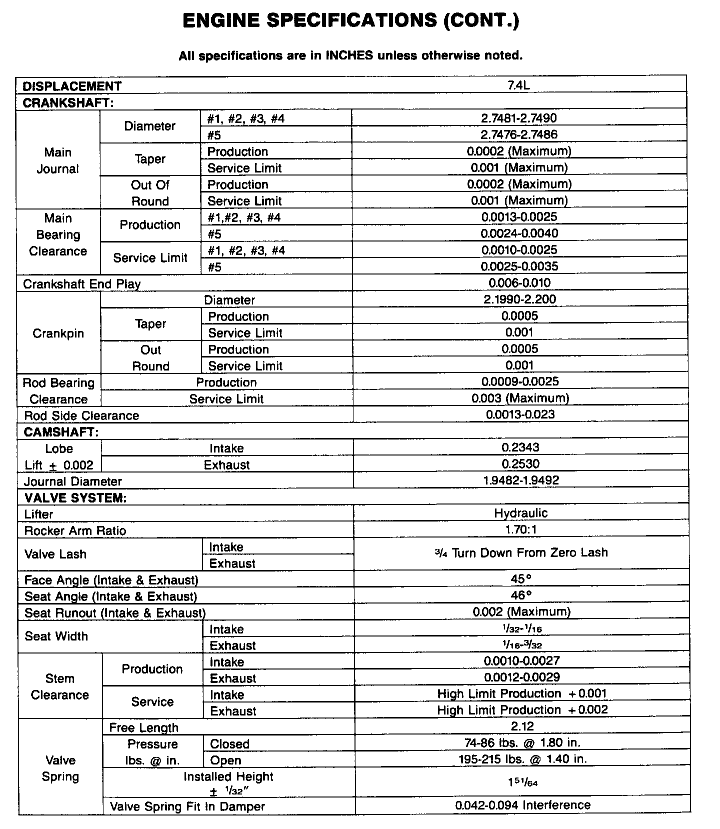 Continued Engine Specifications: