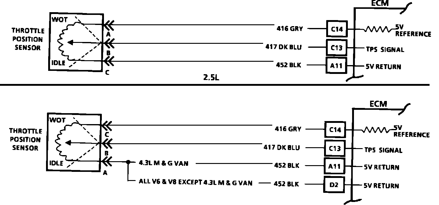 A "Scan" tool reads throttle position in volts. Should read about .73 volts (2.5L), .48 volts (2.8L), .60 volts (4.3L & V8) +/- .08 volts with throttle closed and ignition on or at idle. Voltage should increase at a steady rate as throttle is moved toward WOT.