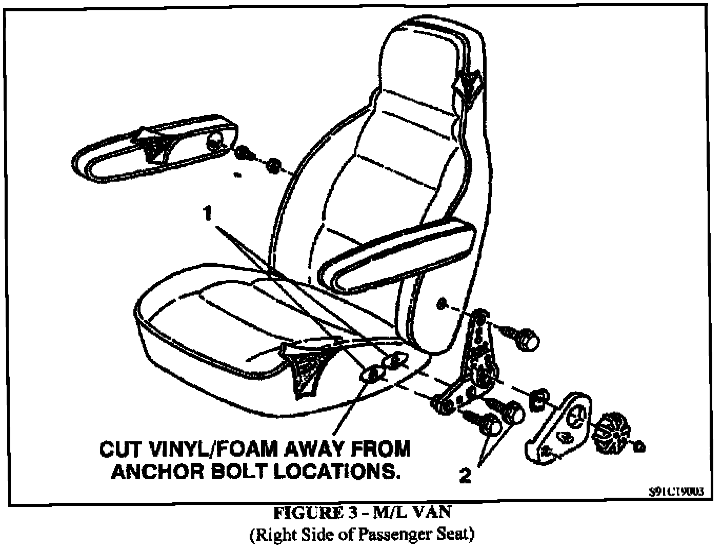 3. Remove the seat from the vehicle, by removing four seat riser to floor retaining nuts (do not discard). To provide support, lay seat on side on workbench or equivalent.