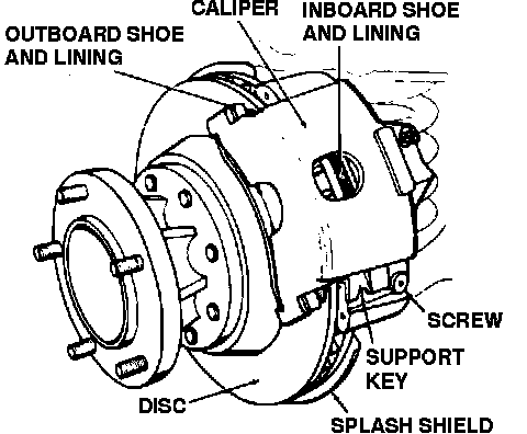 The sliding caliper attaches to and slides on the steering knuckle. The caliper assembly is held in place with a support key and spring Fig. 1. A screw prevents the key from sliding on the steering knuckle. The friction material is bonded with rivets. The inboard and outboard brake pads are not interchangeable.