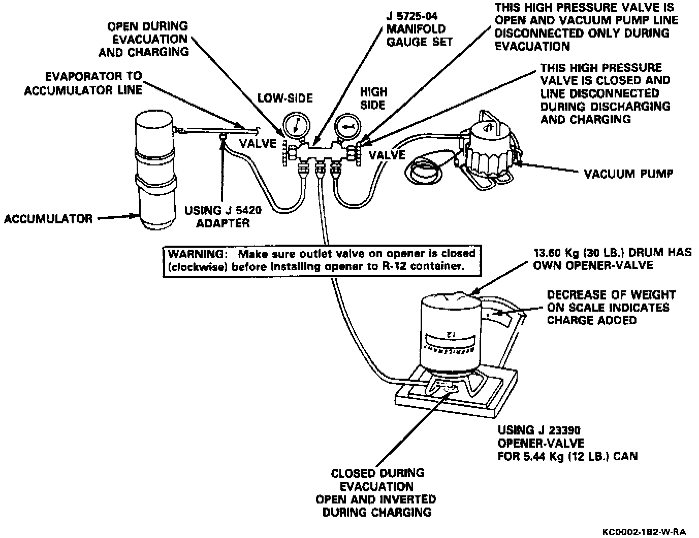 WARNING: NEVER REMOVE A GAGE LINE FROM ITS ADAPTER WHEN LINE IS CONNECTED TO A/C SYSTEM. ALWAYS REMOVE THE LINE ADAPTER FROM THE SERVICE FITTING TO DISCONNECT A LINE. DO NOT REMOVE CHARGING HOSE AT GAGE SET WHILE ATTACHED TO ACCUMULATOR. THIS WILL RESULT IN COMPLETE DISCHARGE OF SYSTEM DUE TO THE DEPRESSED SCHRADER VALVE IN SERVICE LOW-SIDE FITTING, AND MAY CAUSE PERSONAL INJURY DUE TO ESCAPING REFRIGERANT-12.