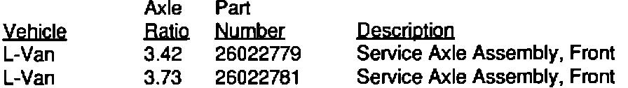 Do not replace either the ring and pinion gear set, pinion flange assembly, or the pinion bearings in a 1990-93 L-van front axle. If replacement of one of these parts is necessary, replace the entire axle assembly, using the system-balanced service axle assemblies listed below.