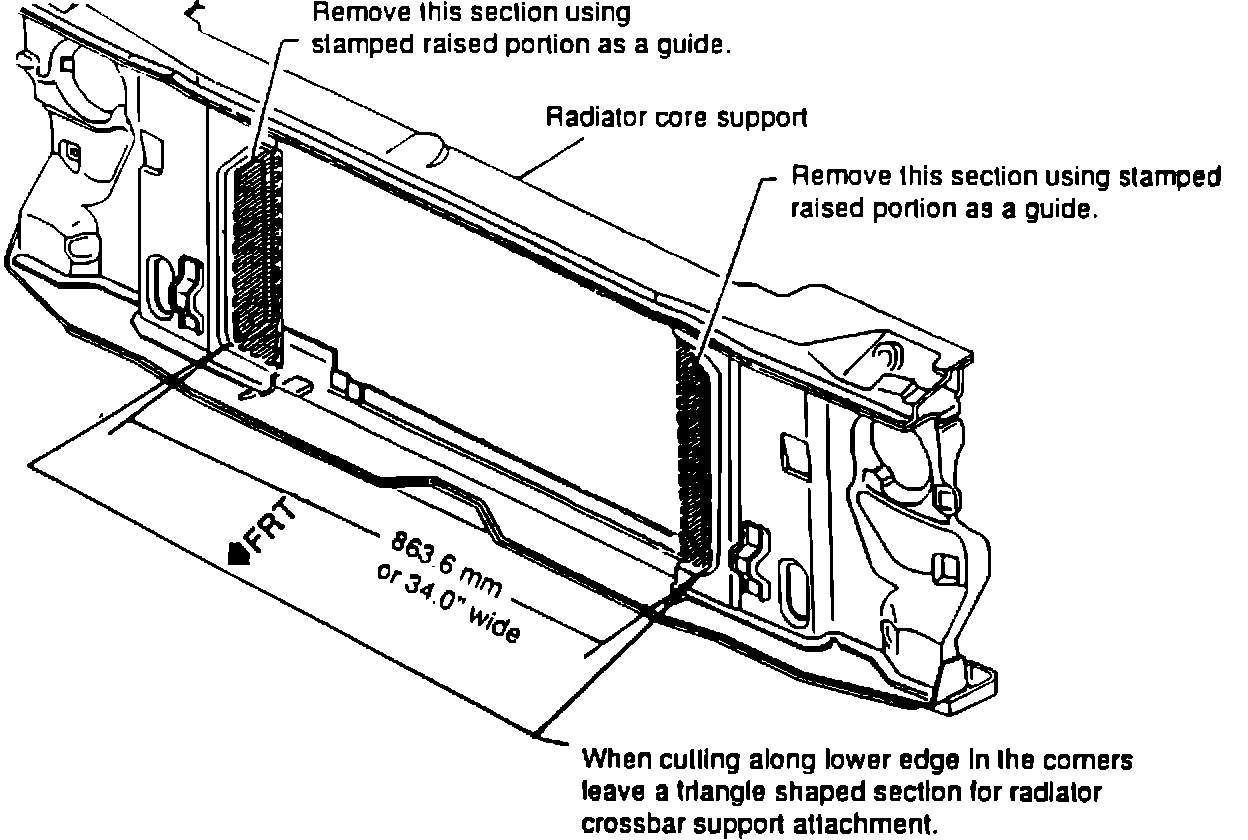 13. To enlarge the radiator core support opening to the dimension shown in Figure 1, mark the sections of the core support to be removed and remove the sections, using a suitable tool