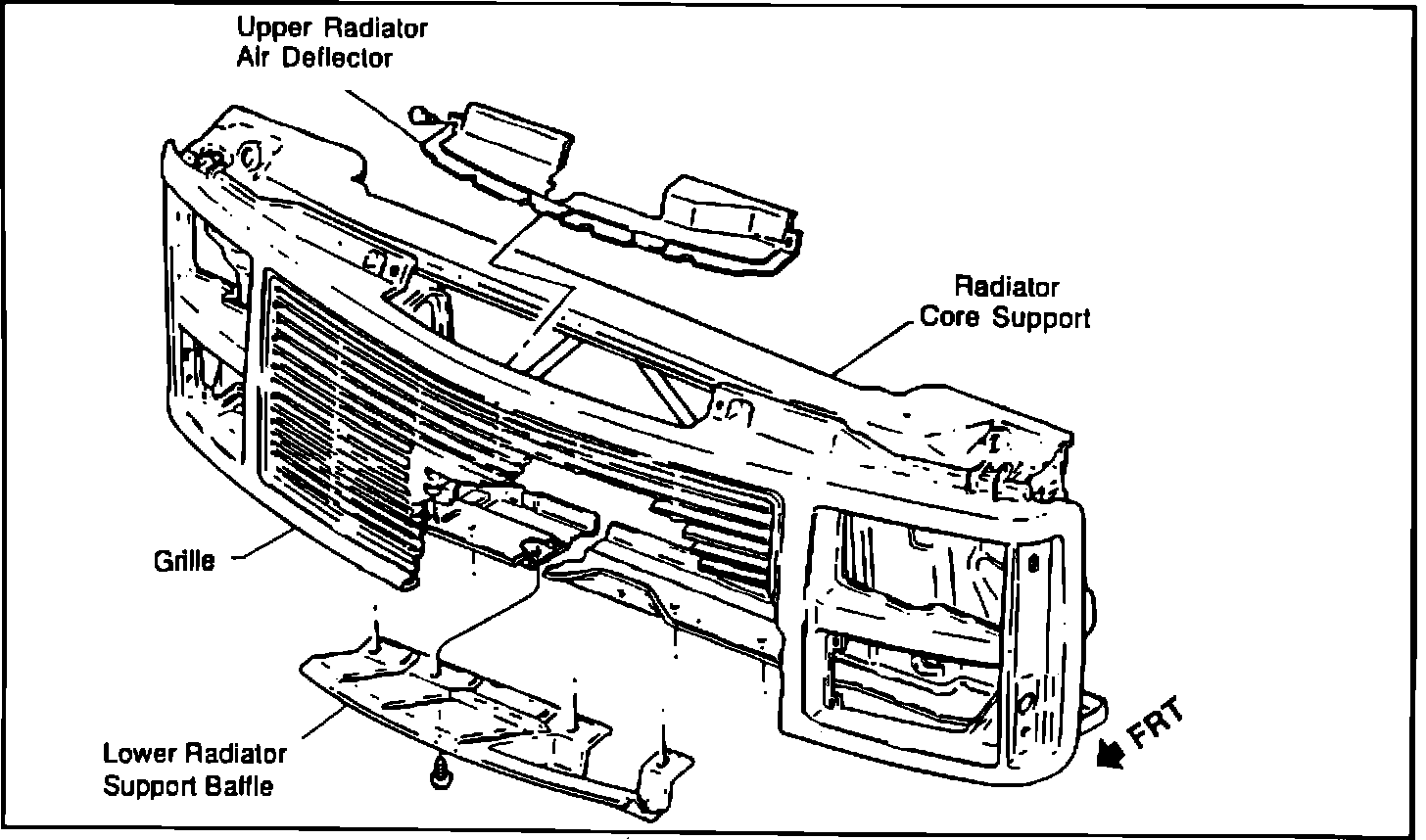 (panel cutter, die grinder with cut-off wheel, panel knibler, etc.). The core support openings are stamped and can be used as a guide. When cutting the lower corners, it is important to leave a small triangle shaped section for proper radiator support rod attachment. The edge of the new opening must be painted to prevent corrosion. Use P/N 1052820 or equivalent.