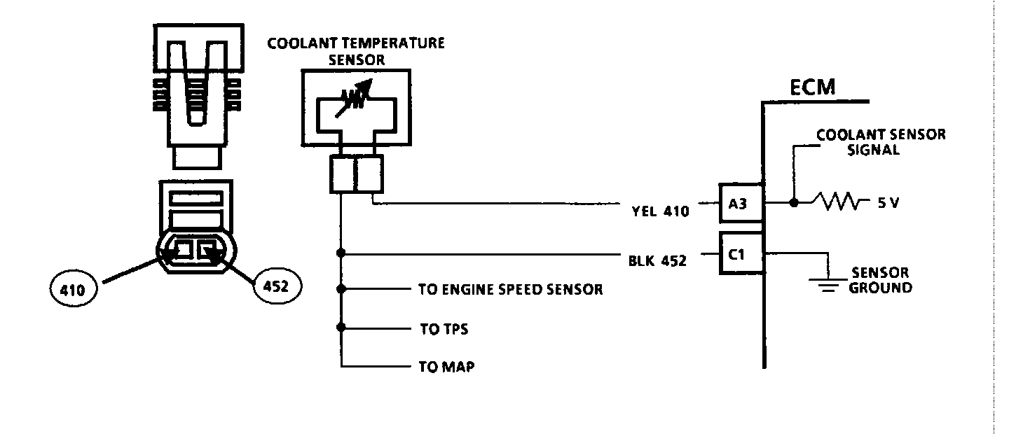 The coolant temperature sensor uses a thermistor to control the signal voltage to the ECM. The ECM applies a voltage on CKT 410 to the sensor. When the engine is cold, the sensor (thermistor) resistance is high, therefore, the ECM will see high signal voltage.