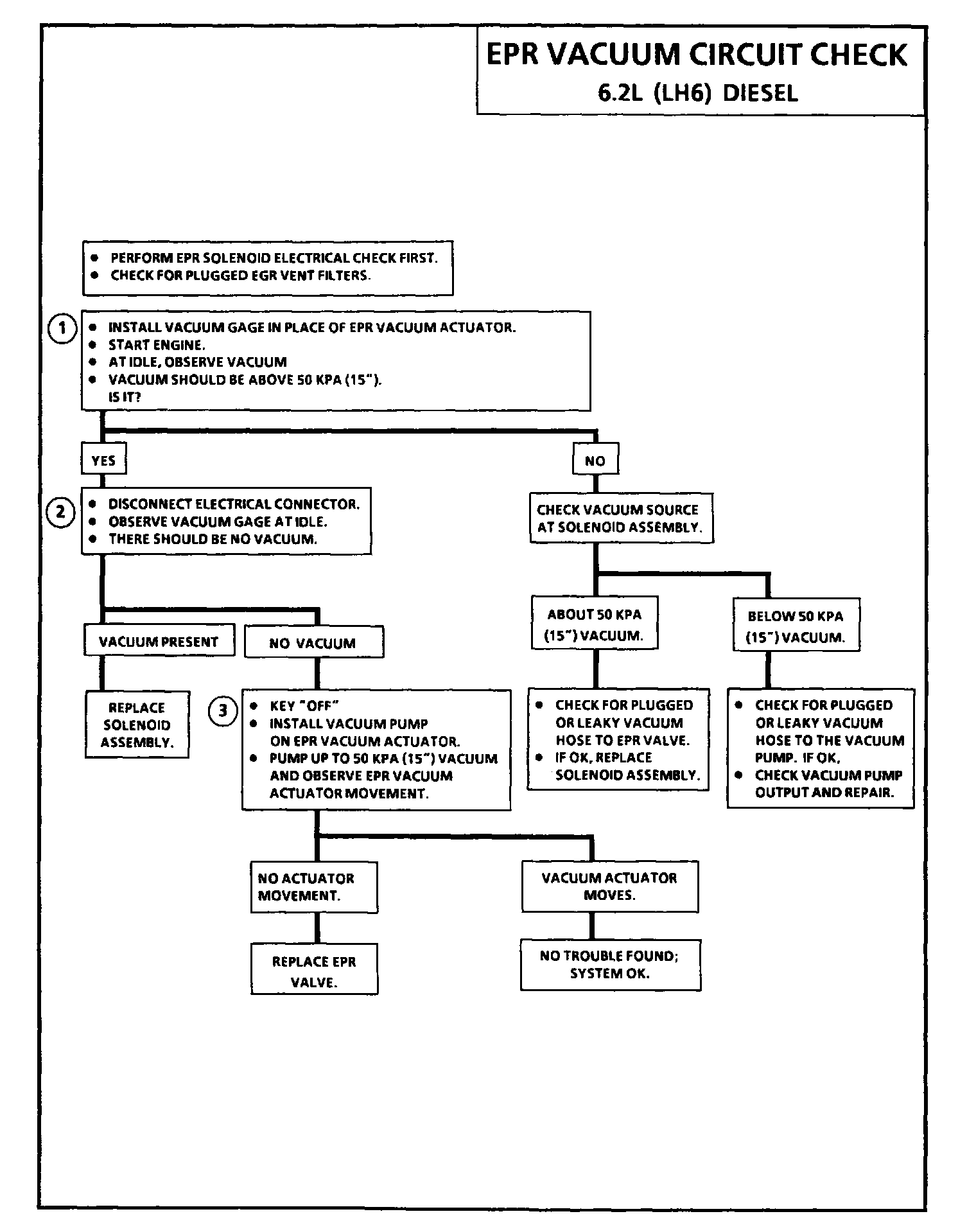 1. Checks for normal EPR vacuum at idle. Since electrical circuit was verified as OK on prior chart, if no vacuum is present, it is due to no source vacuum (vacuum pump) or a restriction or leak in vacuum lines to valve, including the solenoid.