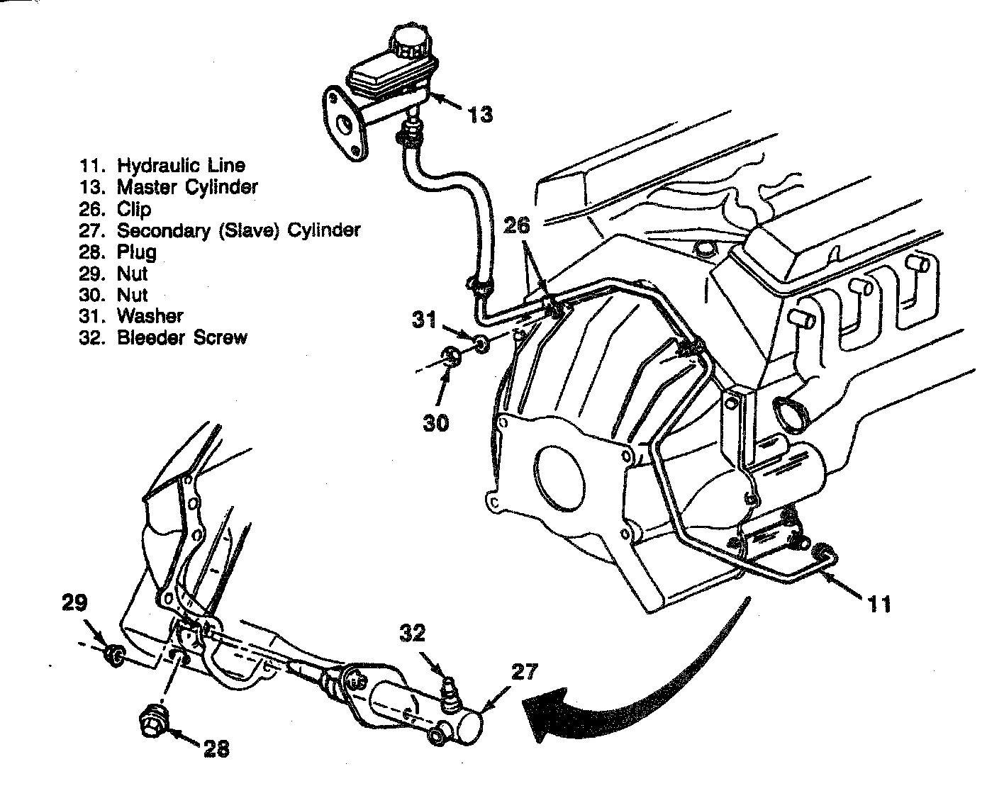 3. Hold the clutch pedal down, open the bleeder screw (32) to let air and fluid escape, and close the bleeder screw (32). Let the clutch pedal up.