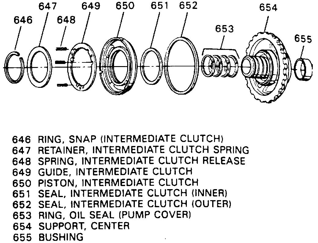 5. Remove inner (651 )and outer seals (652)from clutch piston. Do not remove three screws holding holding roller clutch race to center support.