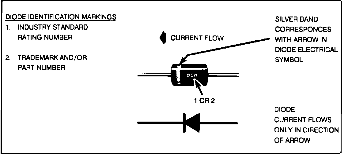 4. Check current flow direction of the new diode, being sure to install the diode with correct bias. Reference the appropriate service manual wiring schematic to obtain the correct diode installation position. Reference Figure 1 for replacement diode symbols and current flow explanations.