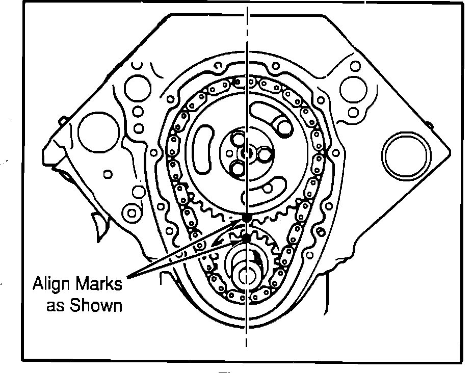 d) Rotate crankshaft in a clockwise direction (by placing a socket or wrench on previously installed bolt) until timing mark on camshaft sprocket is pointing straight down toward crankshaft.