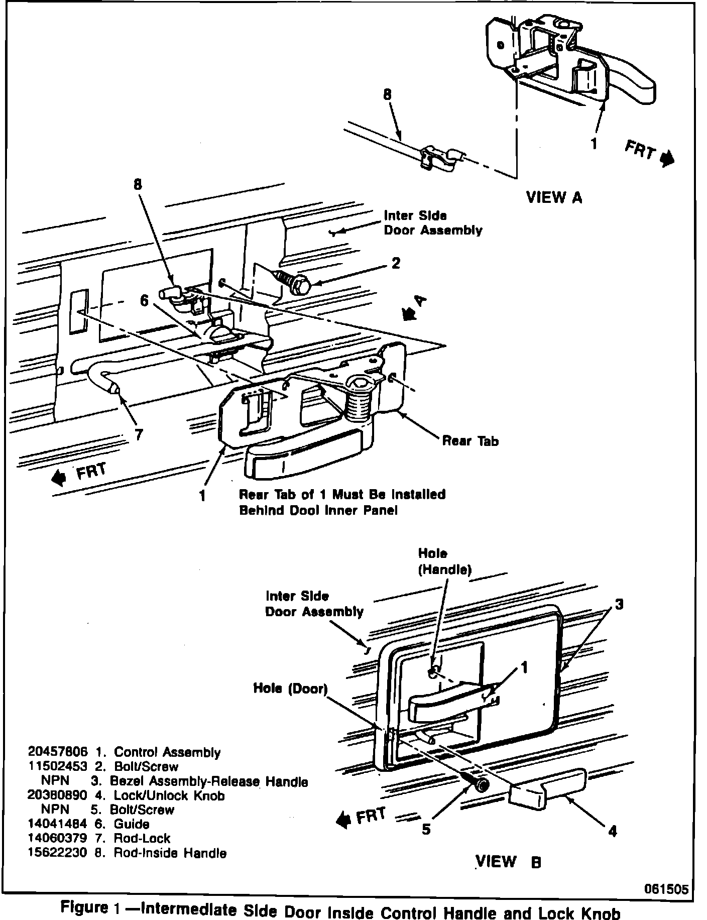 13. Reinstall the control assembly (Figure 1, View B, 1) to inside handle rod and door. Torque control assembly mounting fastener, 1 to 1-1/2 N-m (10-14 lbs.in). Check for proper operation, correct as necessary. If the inside handle rod rattles, reposition inside handle rod insulator (11) to eliminate condition.