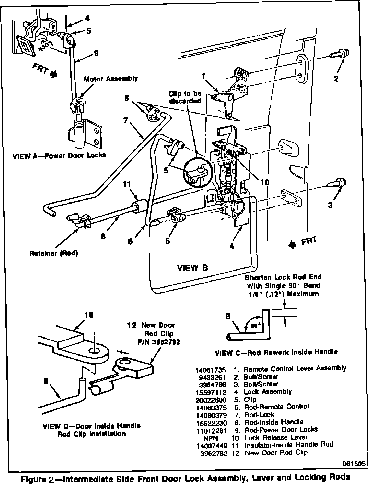 10. Align holes of new spring steel clip (P/N 3962782) (Figure 2, View D, 12) over the lock release lever hole. Install modified inside handle rod end (90 degree bend) through both holes of the new clip and lock release lever hole. Insert from bottom up. Snap inside handle rod into retaining portion of the new clip (Figure 2, View D).