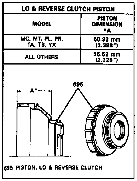 A new lo and reverse clutch assembly for 1986-87 model transmissions, is now in production. The new lo and reverse clutch assembly components may be used on all transmissions built from 1986 to 1987 only if all the new service parts and procedures for selection of clutch pack clearance are used during assembly.1. Inspect lo and reverse piston for porosity or ring groove damage.