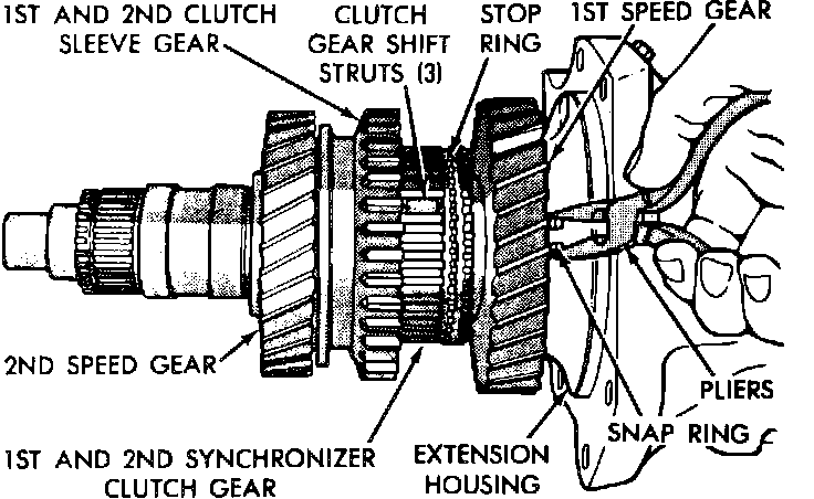 4. Remove snap ring retaining 3rd-4th synchronizer clutch gear and sleeve assembly, then slide assembly from mainshaft.