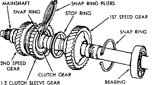 8. Remove bearing, bearing retainer ring, speed gear and 1st speed stop ring from shaft.