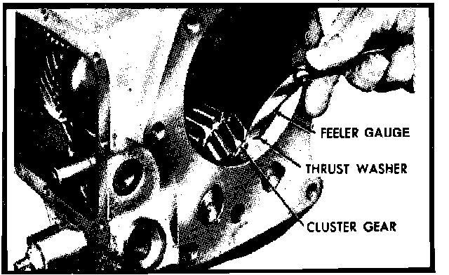 10. Measure countershaft gear end-play by inserting a feeler gauge between thrust washer and gear, Fig. 5. End-play should be 0.015"-0.029". If not, install new thrust washers when reassembling transmission.