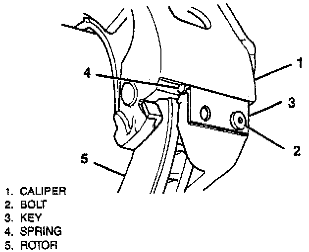 6. Align caliper with steering knuckle abutment surfaces, then insert support key and spring between abutment surfaces at the trailing end of caliper and steering knuckle. With a hammer and brass drift, drive caliper support key and spring into position, then install and torque support key retaining screw to 16.2-24.3 Nm (12-18 ft lb).