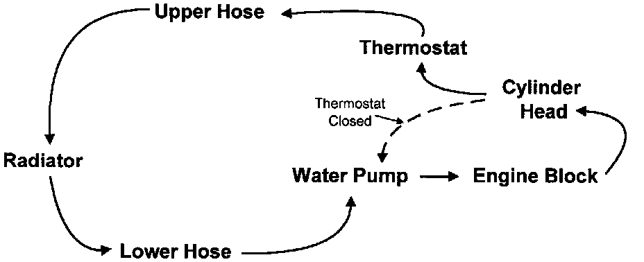 With a cold engine the thermostat is closed, forcing coolant to re-circulate through the engine block and head assembly. This results in a rapid warm up of the coolant.