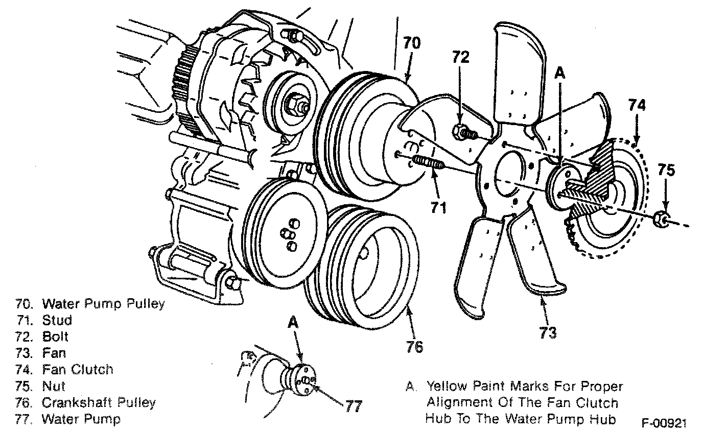 4. Remove Fan (73), fan clutch (74) and the pulley (70) from the water pump (91).