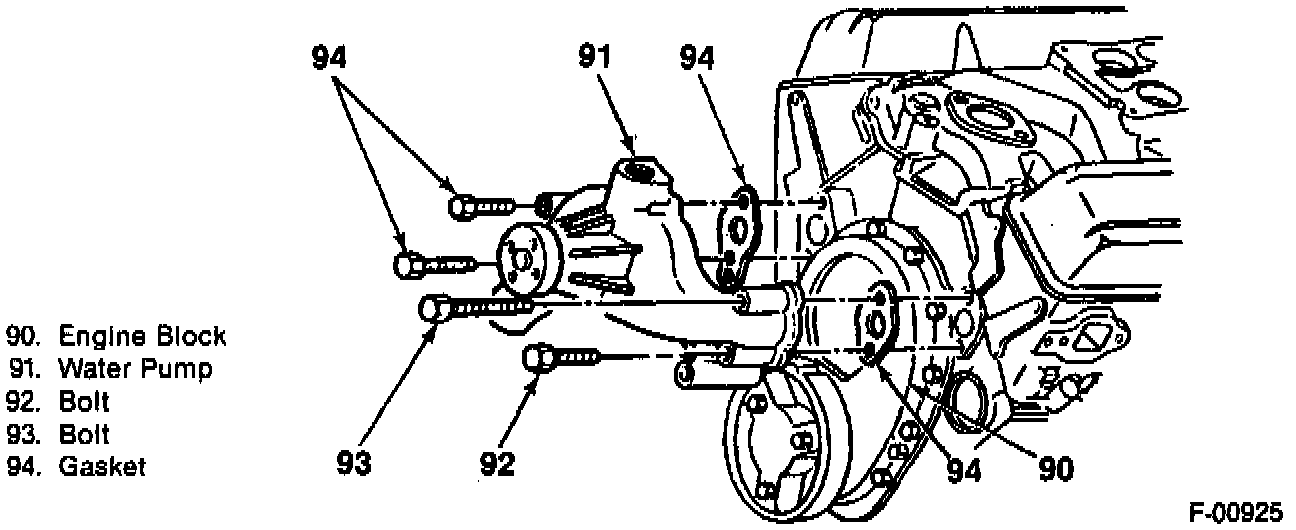 ^ Clean the mating surfaces on the water pump and the engine block. Inspect all components for defects.