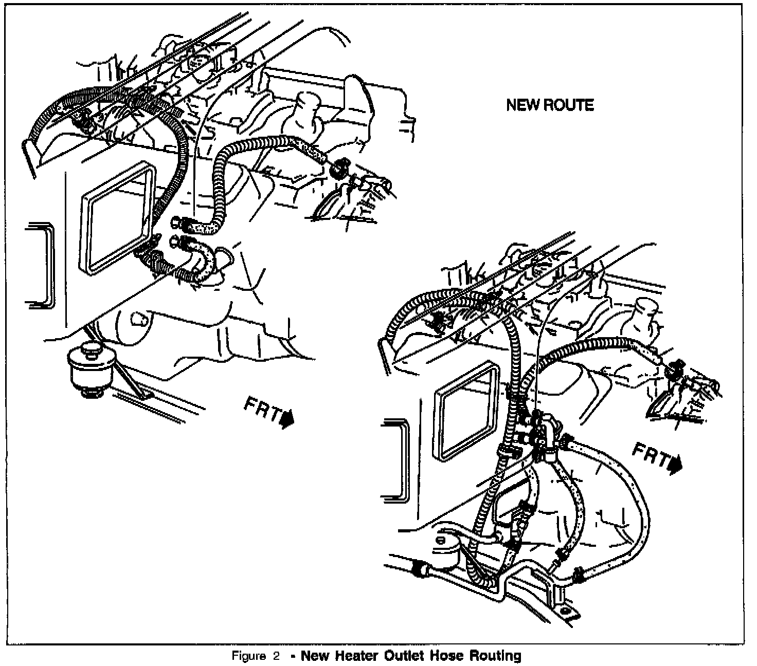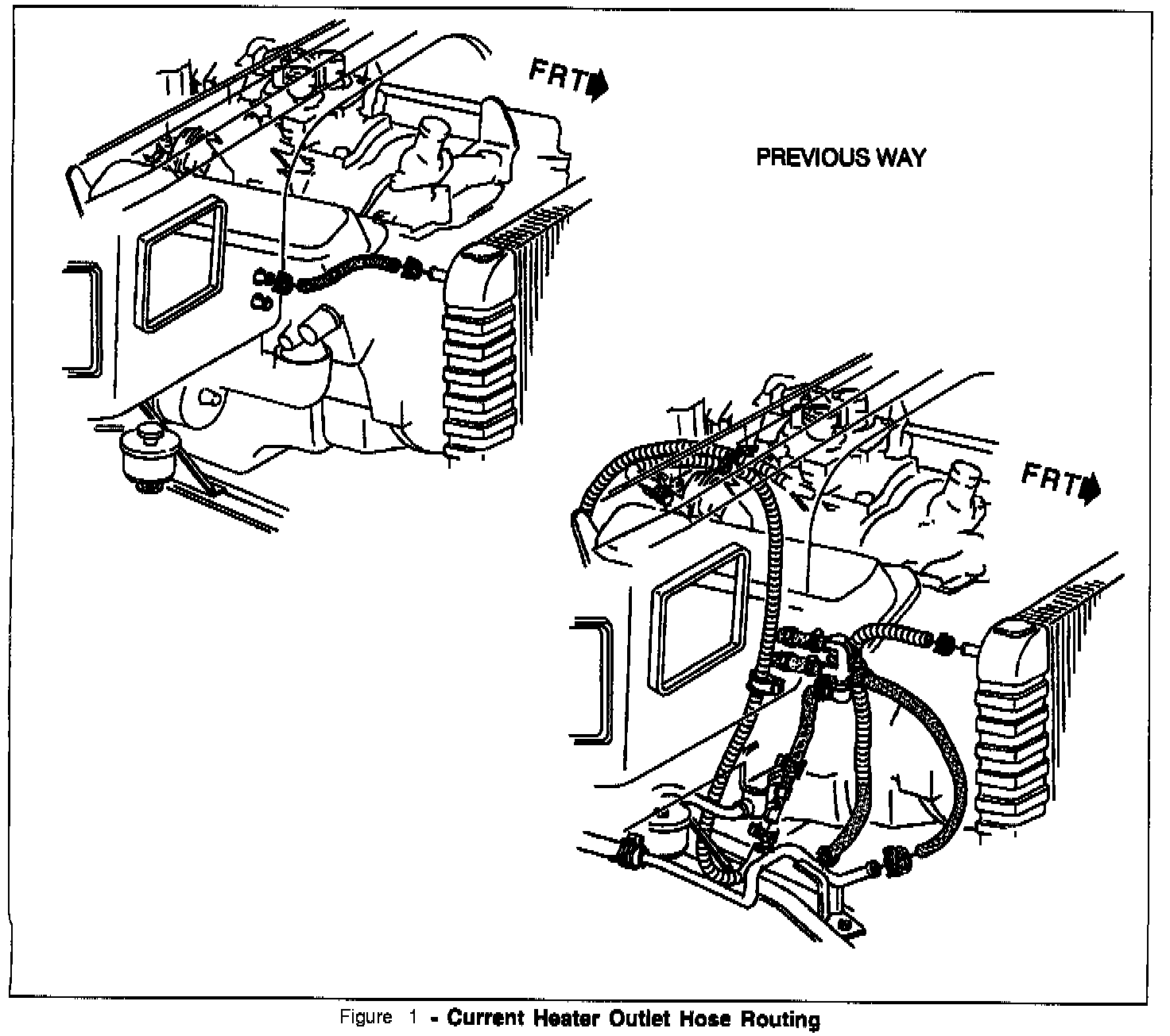 3. Remove the heater outlet hose. There are 2 methods of routing. Reference (Figure 1) for the Old routing. Once the hose has been removed, it will be necessary to save approximately 3 inches of hose material. This will allow the radiator side of the connection to be plugged.
