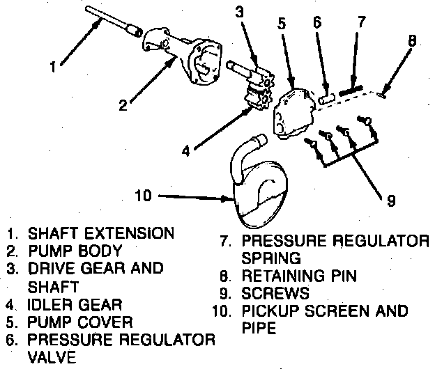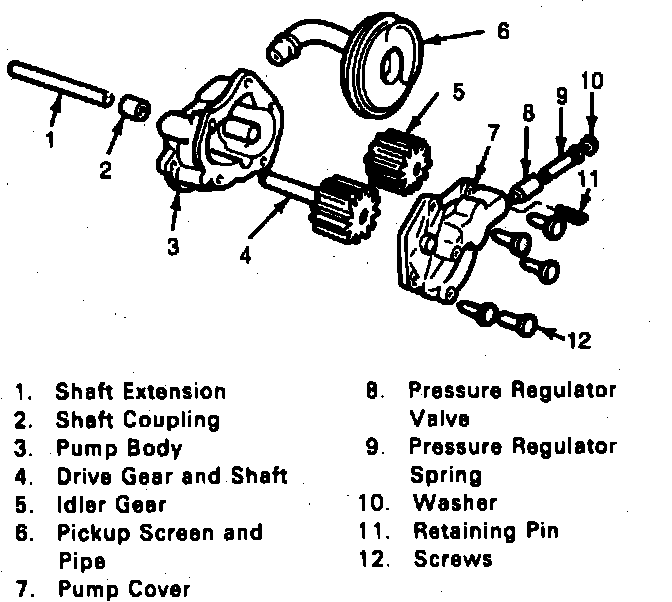 13. Reverse procedure to assemble. Turn driveshaft by hand to check for smooth operation. The pump gears and body are not serviced separately. If the pump gears or body are damaged or worn, the pump assembly should be replaced. Also, if the pickup screen was removed, it should be replaced with a new one as loss of the press fit condition could result in an air leak and loss of oil pressure.