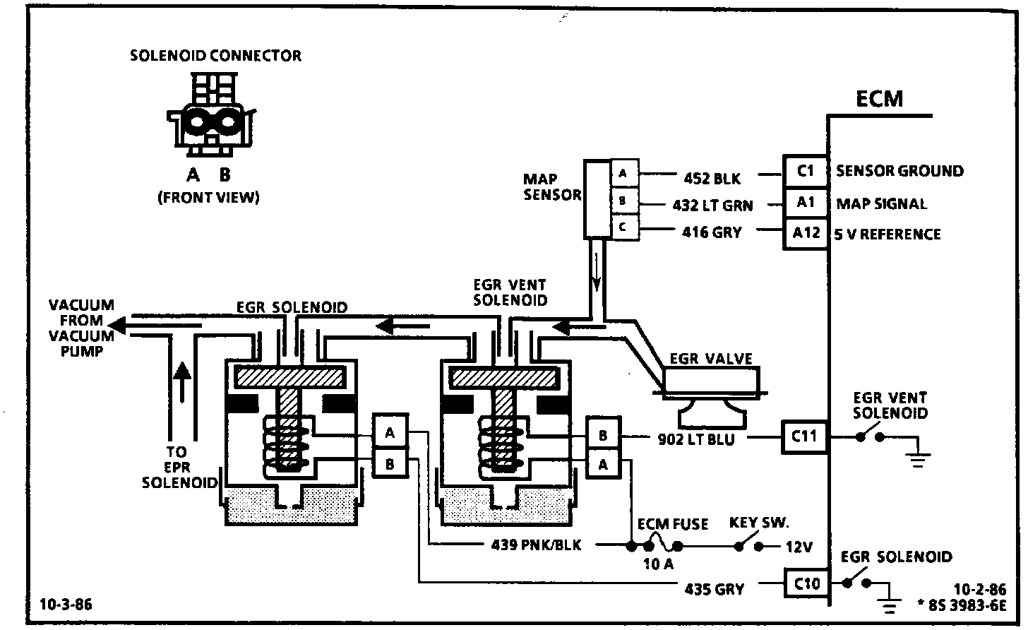 A Manifold Absolute Pressure (MAP) sensor is used to monitor the amount of vacuum in the EGR circuit. It senses the actual vacuum in the EGR vacuum line and sends a signal back to the ECM. The signal is compared to the EGR duty cycle calculated by the ECM. If there is a difference in the ECM command and what is at the EGR valve sensed by the MAP, the ECM makes minor adjustments to correct. When a major difference is sensed, the ECM recognizes a fault and sends a maximum EGR signal.