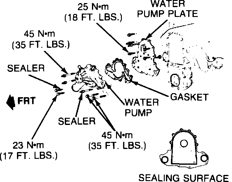 5. Disconnect bypass hose and lower radiator hose. Remove water pump plate and water pump, Fig. 35.