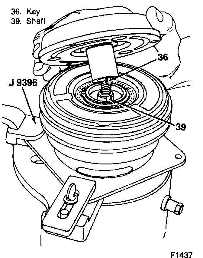 ^ Hold the center screw with a wrench and tighten the hex portion of J 9401-B body while pressing the hub onto the shaft (39). After tightening the body several turns, remove J 9401-B and check that the shaft key (36) is properly in place in the keyway.