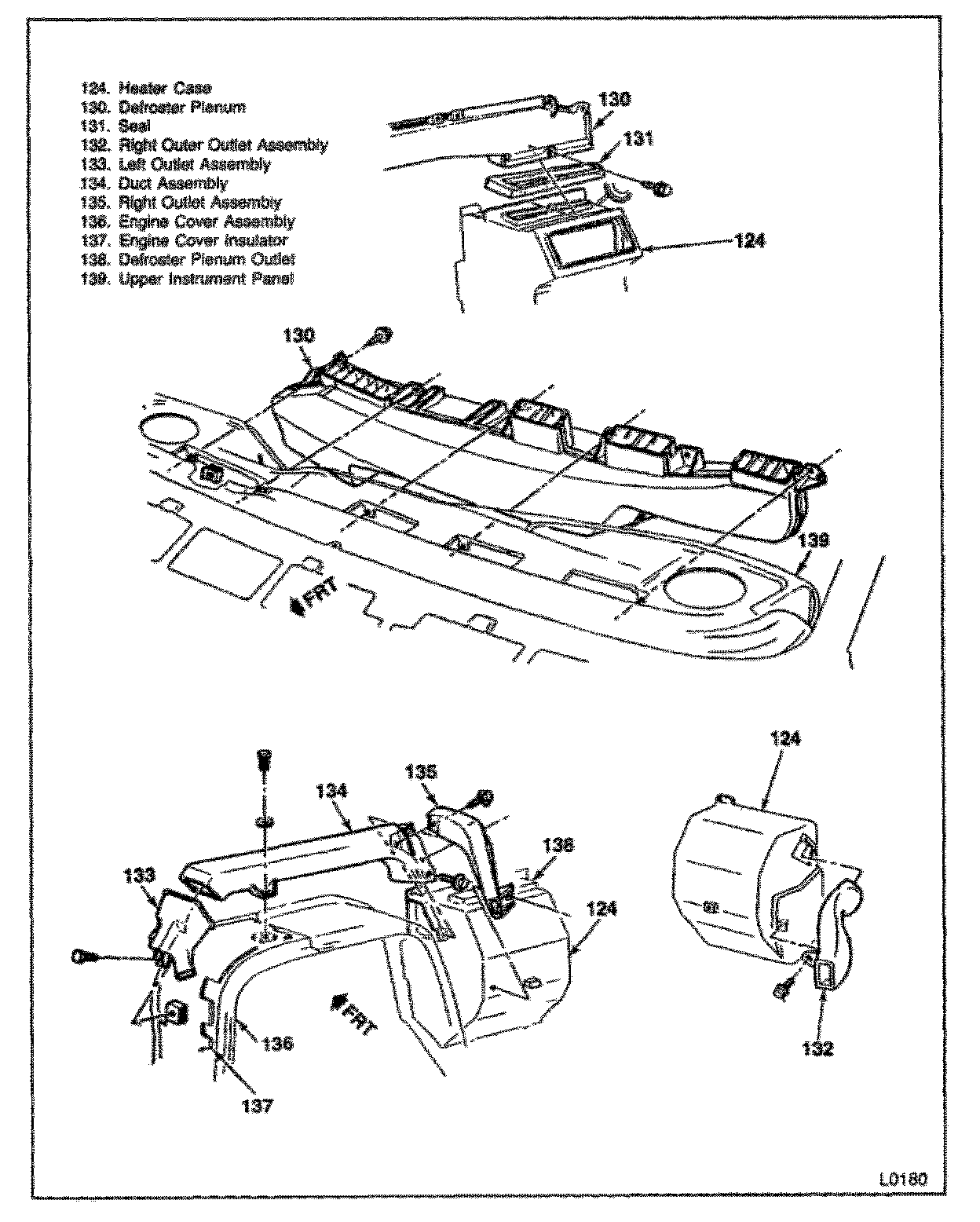 ^ Remove screws that hold the defroster duct to the instrument panel.