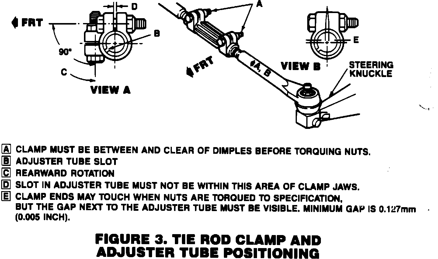 2. Inspect tie rod clamps for looseness. Also, inspect toe-in. See Figures 1 and 2. Toe-in should be 0 degrees plus or minus 0.20 degrees.
