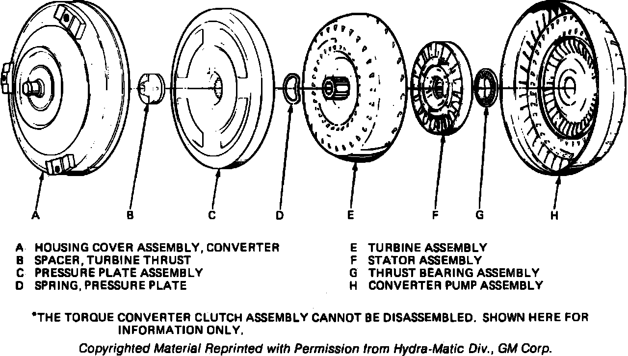 The torque converter hydraulically couples the engine power to the gear sets and provides additional torque multiplication whenever the converter clutch operates in the unlocked mode. The converter clutch, Fig. 2, allows converter drive and driven members to operate as one unit when applied, providing a mechanical coupling between the engine and transmission.