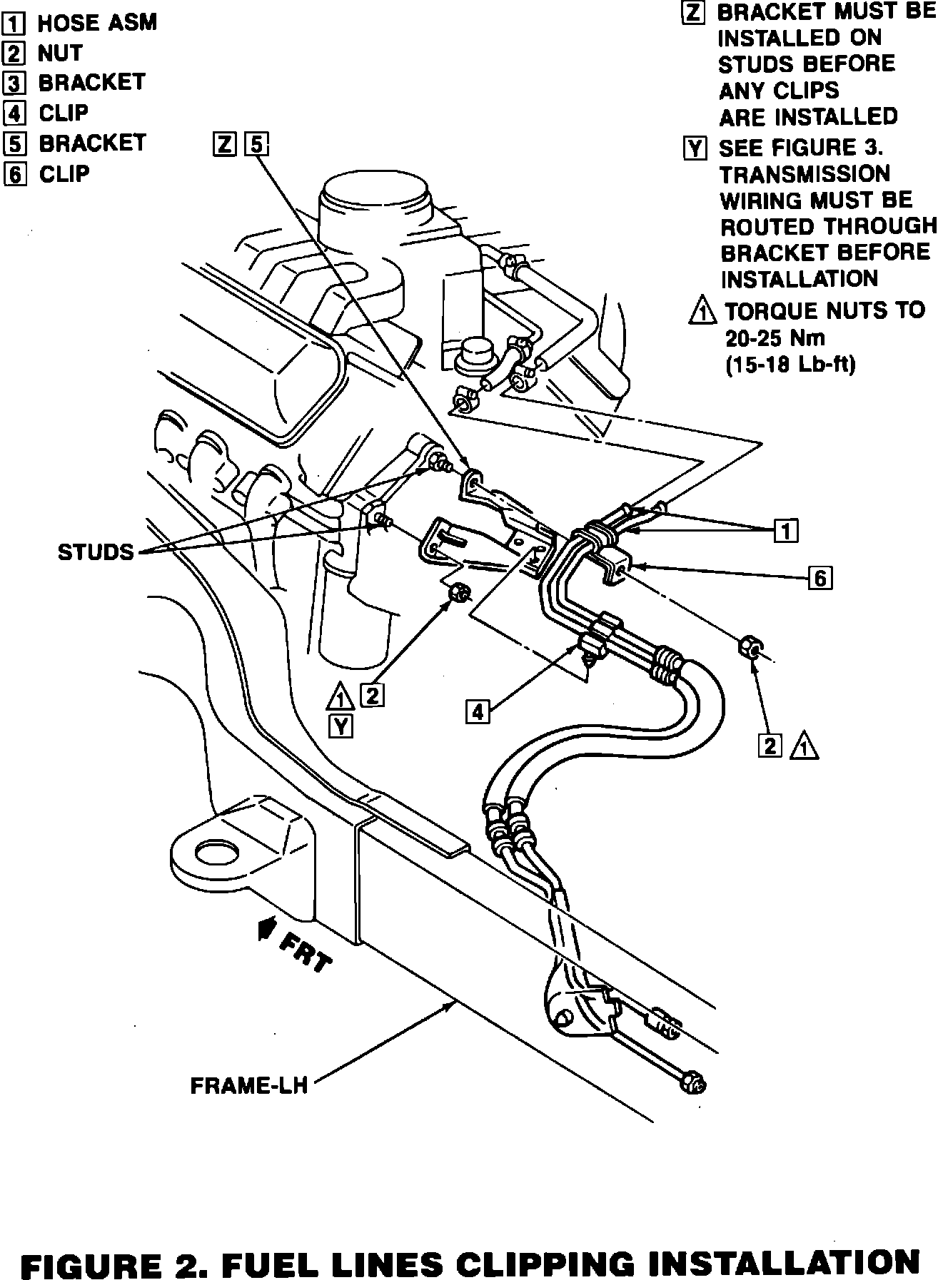 8. Fasten new metal fuel line clip (6) onto upper stud of transmission housing (at bracket) with nut (2, Fig. 2). Torque nut to 20-25 N-m (15-18 lb.ft.)