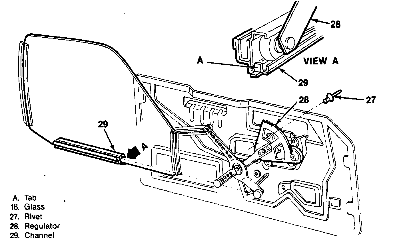 ^ Bend the tab down on the window run channel to slide the door glass from the regulator roller assembly.