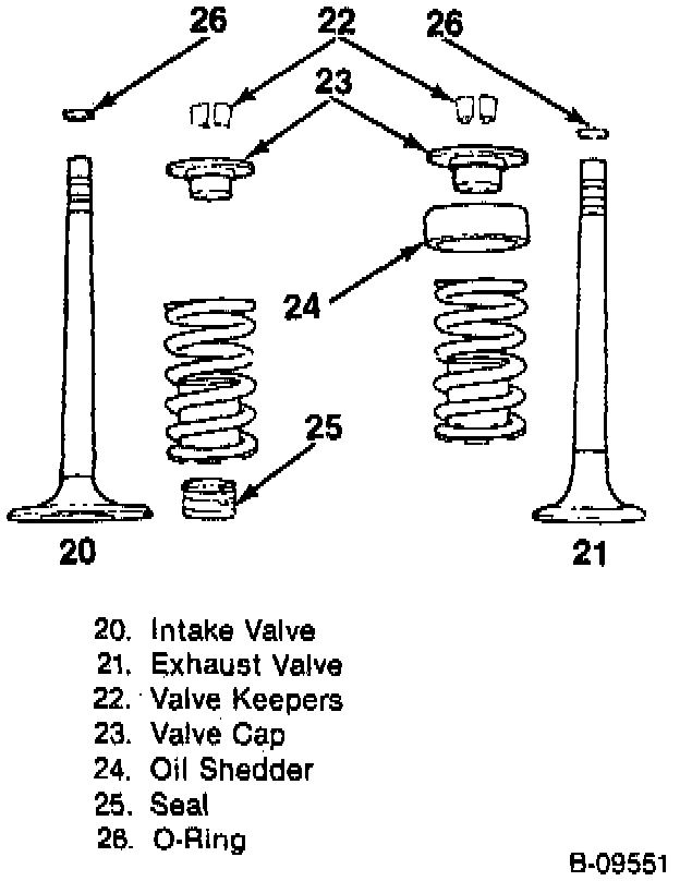 3. Valve keepers (22), valve cap (23), oil shedder (24) (exhaust only), and valve spring and damper.