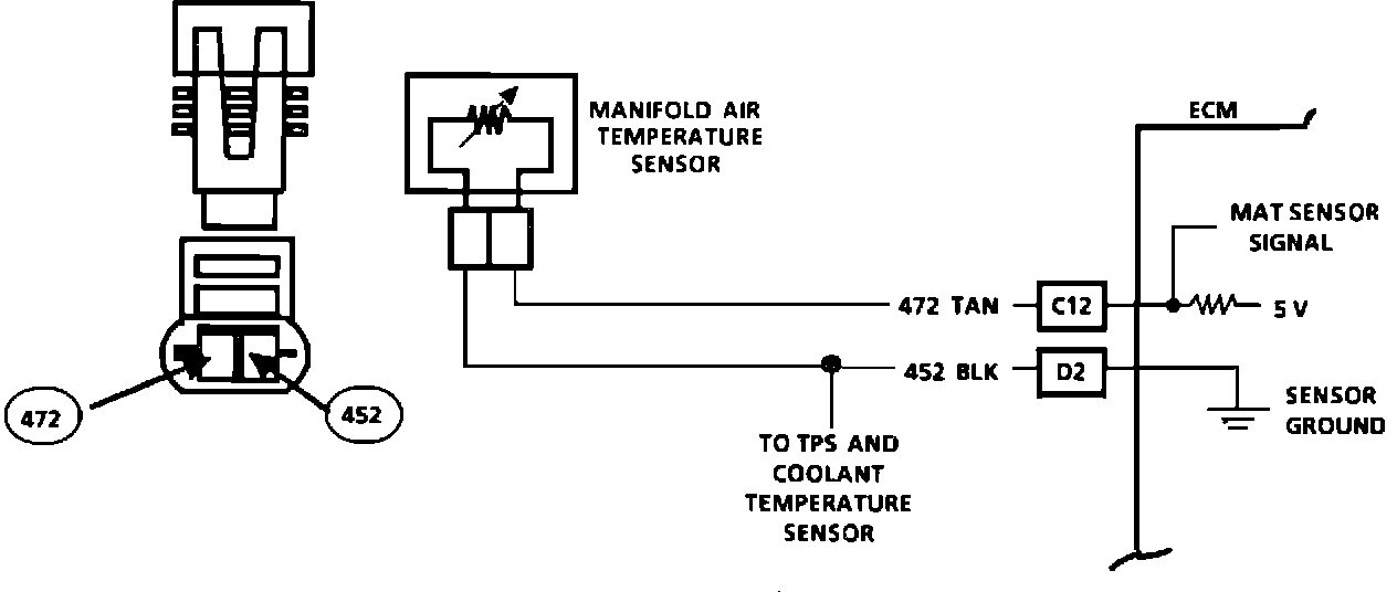 The ECM applies a voltage (4-6 volts) on CKT 472 to the sensor. When the air is cold, the sensor (thermistor) resistance is high, therefore the ECM will see a high signal voltage. If the air is warm, the sensor resistance is low therefore the ECM will see a low voltage.