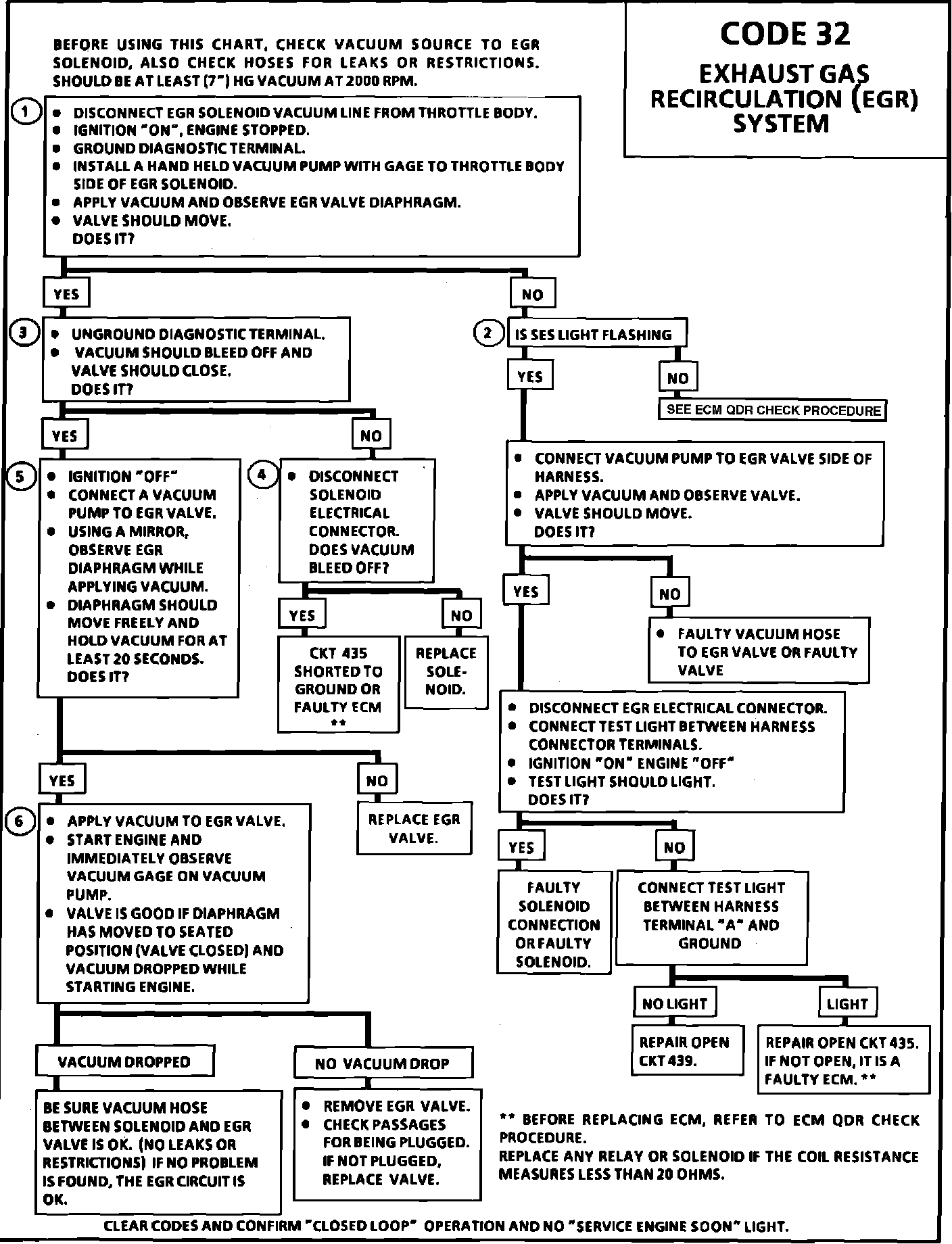The ECM monitors EGR effectiveness by de-energizing the EGR control solenoid thereby shutting off vacuum to the EGR valve diaphragm. With the EGR valve closed and O2 sensor fluctuating normally, fuel integrator counts will be greater than they were during normal EGR operation. If the change is not within the calibrated window, a Code 32 will be set.