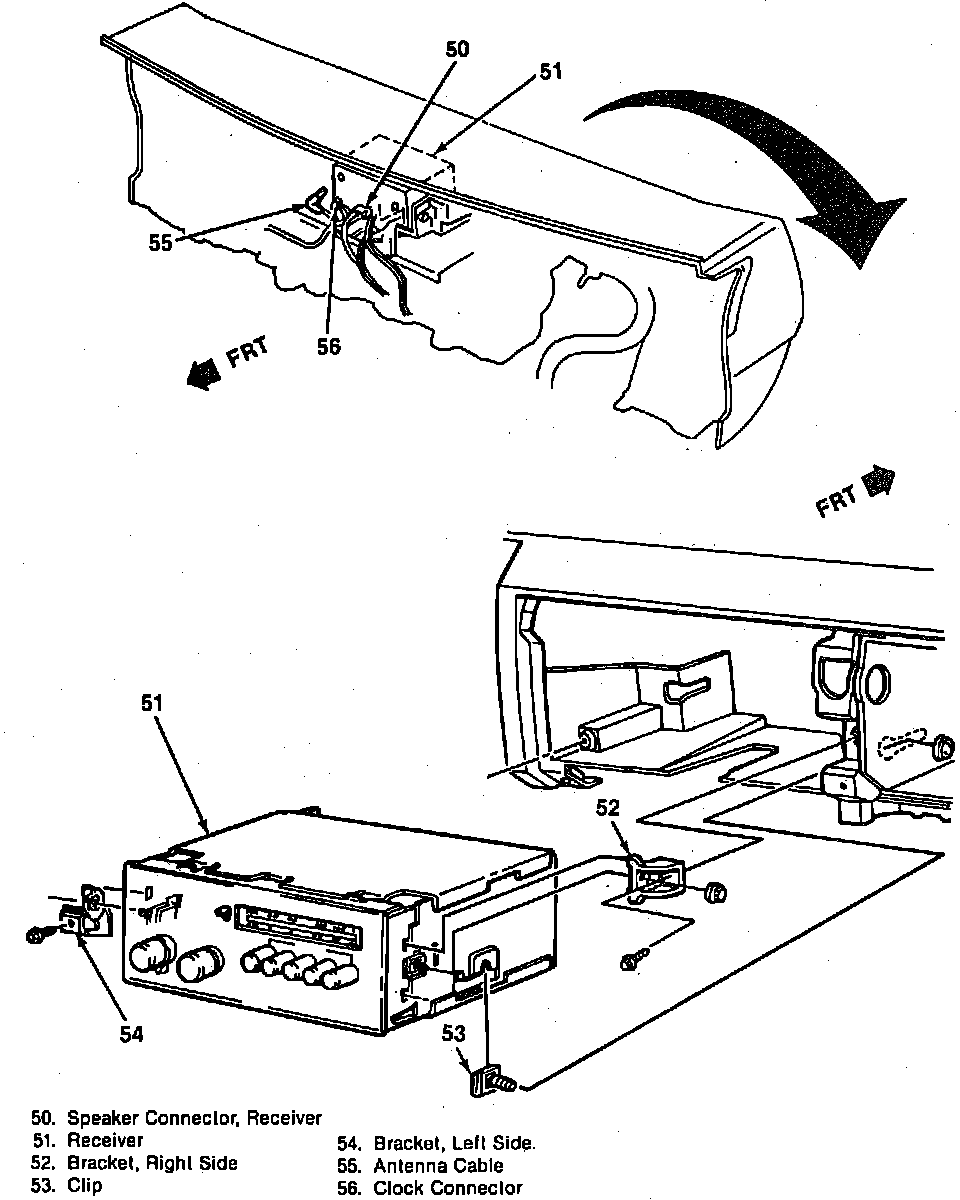 10. Remove support bracket retaining screws, then pull radio rearward and disconnect electrical connectors, antenna cable and speaker connectors.