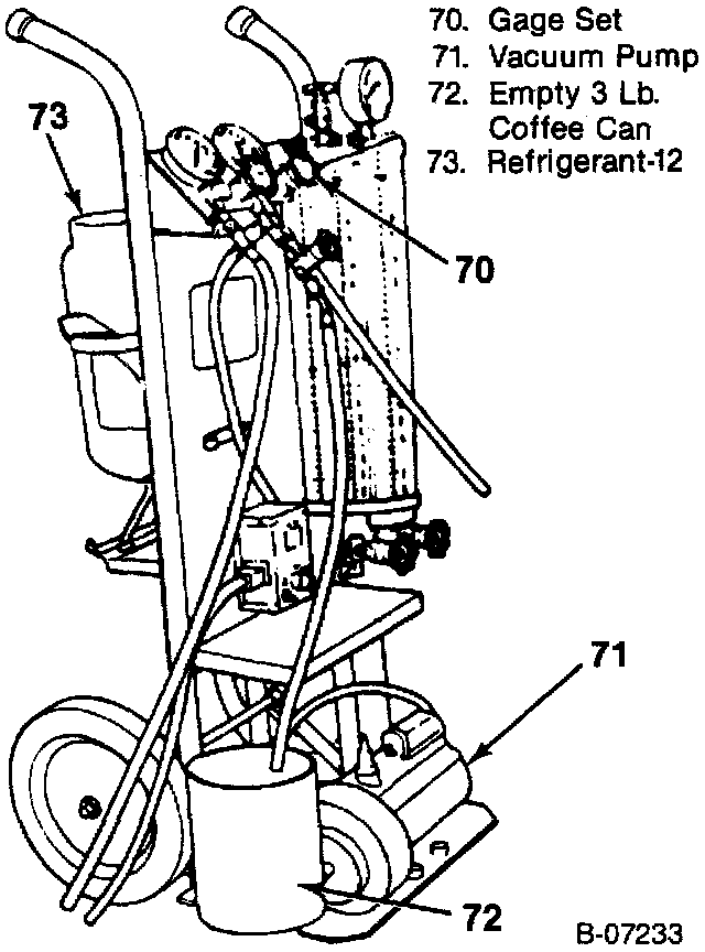 5. After discharging, (no vapor escaping with the hose fully tightened down), measure and record the amount. If 0.014 kg (0.5 oz.) or more, add this amount of new 525 viscosity refrigerant oil plus any quantity in removed parts before evacuation and charging with Refrigerant-12 (refer to "Refrigerant Oil Distribution" for the quantity of oil normally retained in removed parts). Specifications