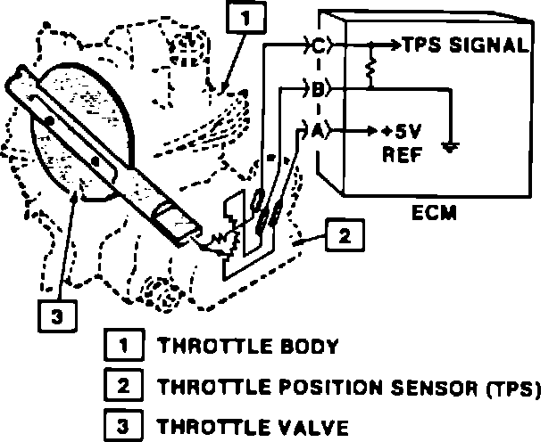 By applying a reference voltage (5.0 volts) to the TPS input, a varying voltage (reflecting throttle position) is available at the TPS output. For example, approximately 2.5 volts results from a 50% throttle valve opening (depending on TPS calibration). The voltage output from the TPS assembly is routed to the ECM for use in determining throttle position.