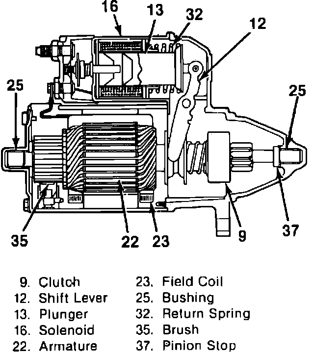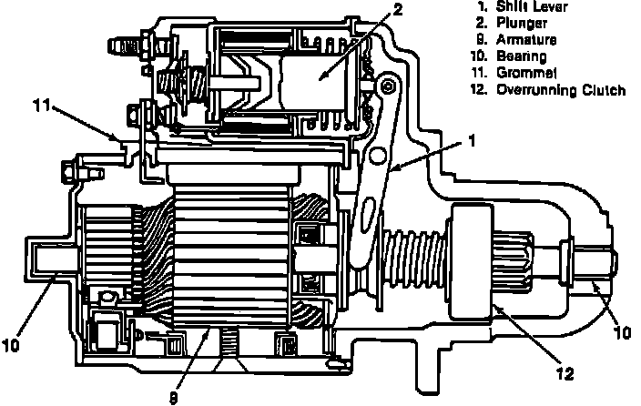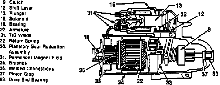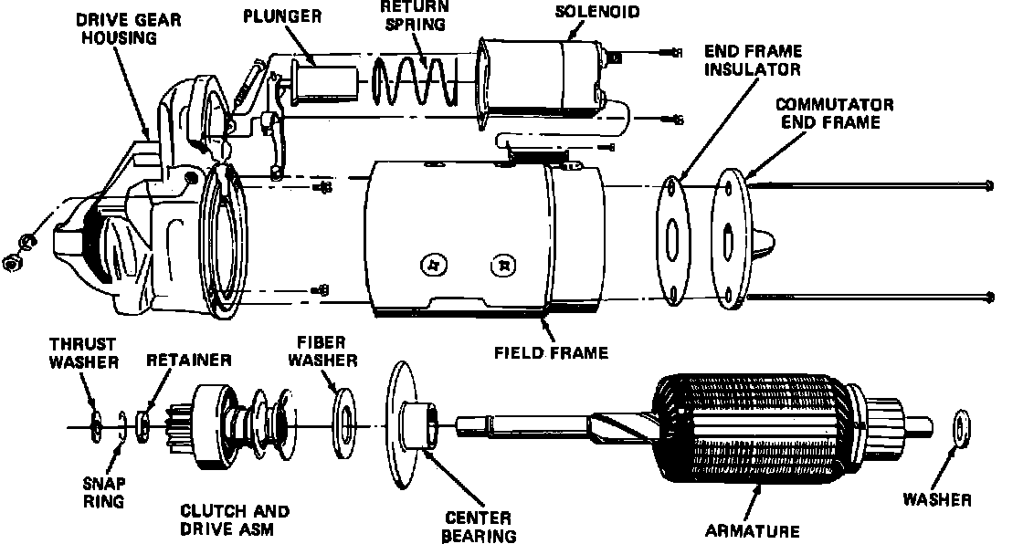 The Delco-Remy starter motor, Figs. 1 through 9, has the solenoid shift lever mechanism and the solenoid plunger enclosed in the drive housing to protect them from exposure to road dirt, icing conditions and splash. They have an extruded field frame and an overrunning clutch type drive. The overrunning clutch is operated by a solenoid switch mounted to a flange on the drive housing. The permanent magnet gear reduction starter has a gear reduction assembly to achieve free speed of up to 7000 RPM. The diesel starters, 25MT and 27MT, have a center bearing.