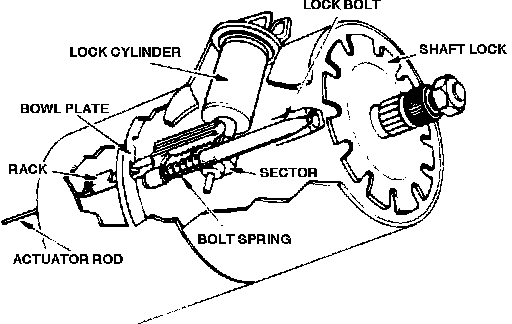 Actuation of the ignition switch is prevented by a mechanical lockout system, Figs. 4 and 5, which prevents the lock cylinder from rotating when the selector lever is out of Park or Neutral. When the selector lever is in Park or Neutral, the slots in the bowl plate and the finger on the actuator rod align, allowing the finger to pass through the bowl plate in turn actuating the ignition switch. If the selector lever is in any position other than Park or Neutral, the finger contacts the bowl plate when the lock cylinder is rotated, thereby preventing full travel of the lock cylinder.