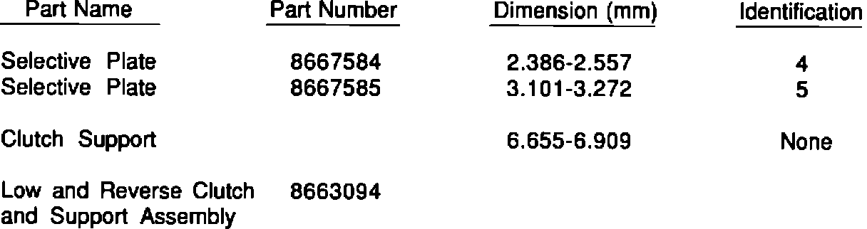 This bulletin covers a dimensional change in the low and reverse clutch support and its selective plates. The thickness of the low and reverse clutch support has increased while the thickness of the selective plates has decreased. Three selective plates are available.