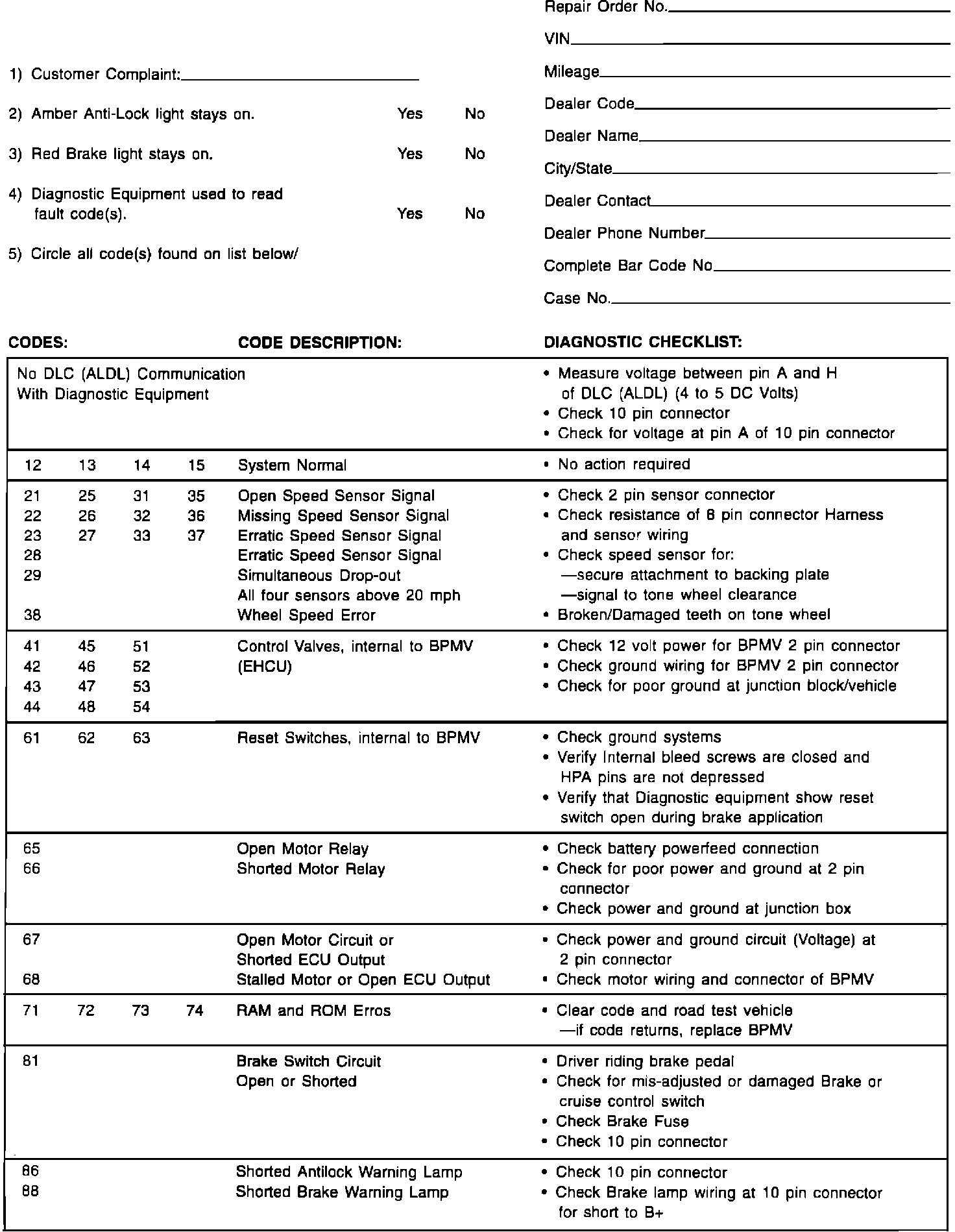 Prior to calling K-TAC (4WAL only), please complete the diagnostic data sheet (make copies of attachment to be included in the paper bulletin to follow), which includes the following information: