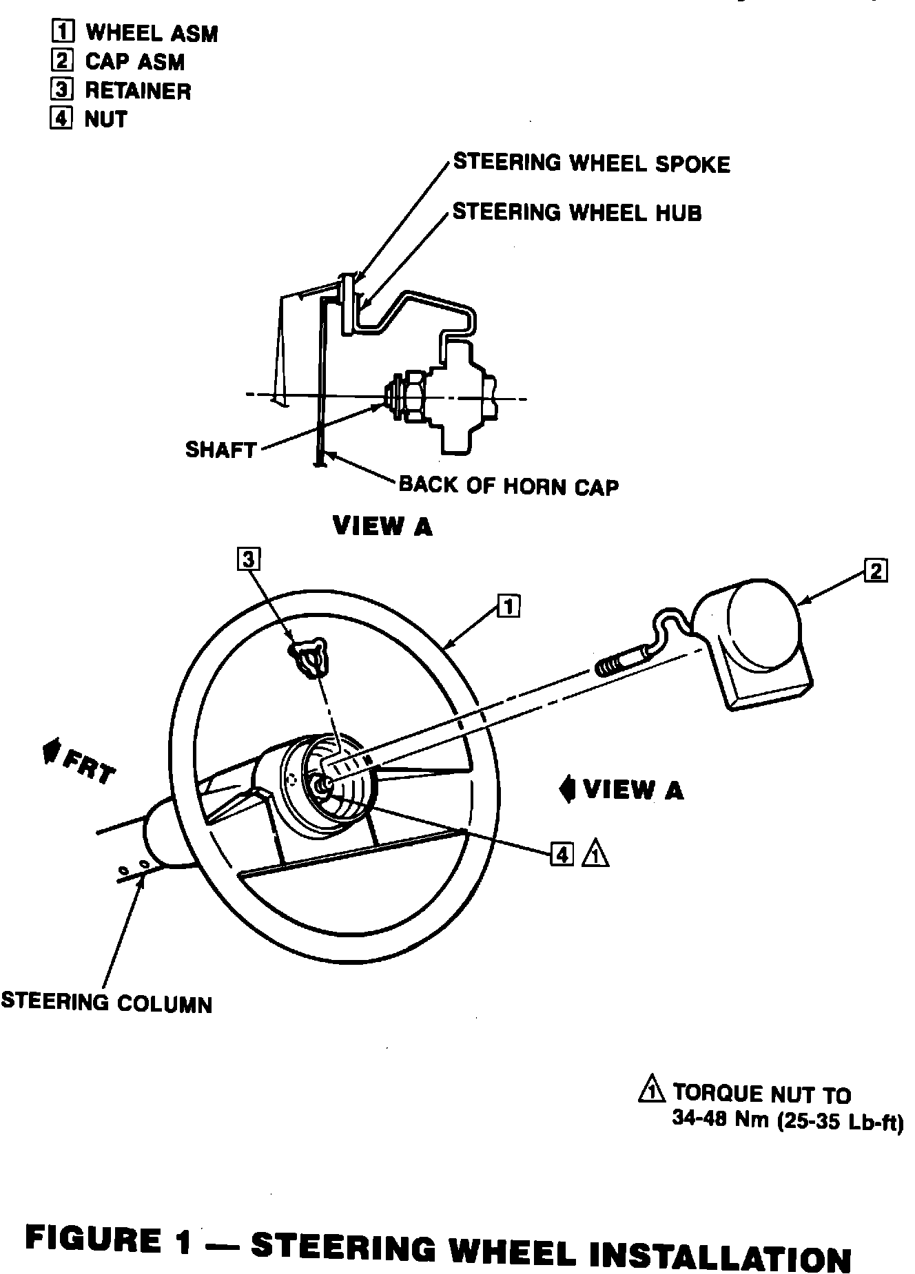 5. Check to see that steering wheel nut (Fig. 1, 4) is properly torqued to 35-58 N-m (25-35 lb.ft.).