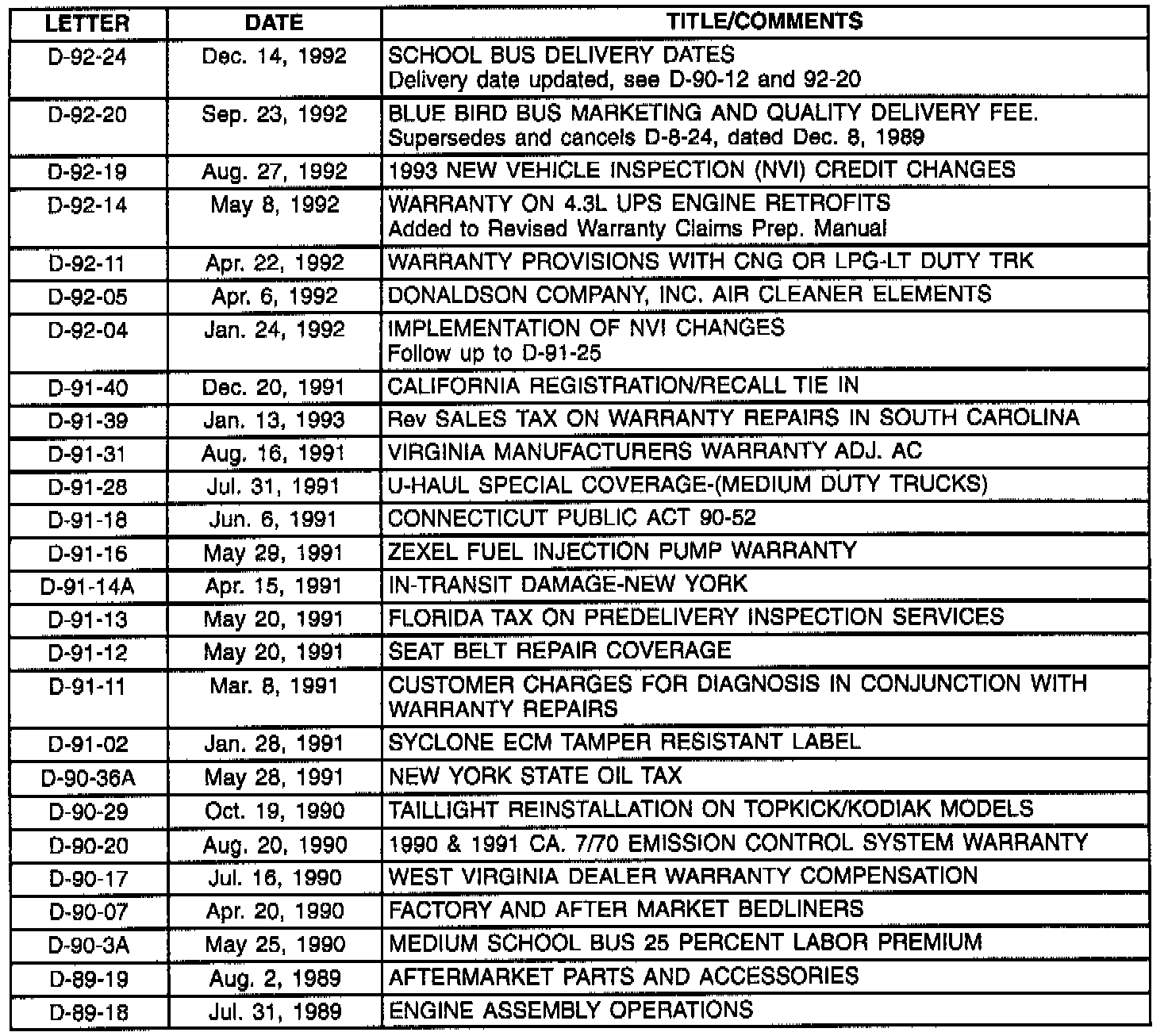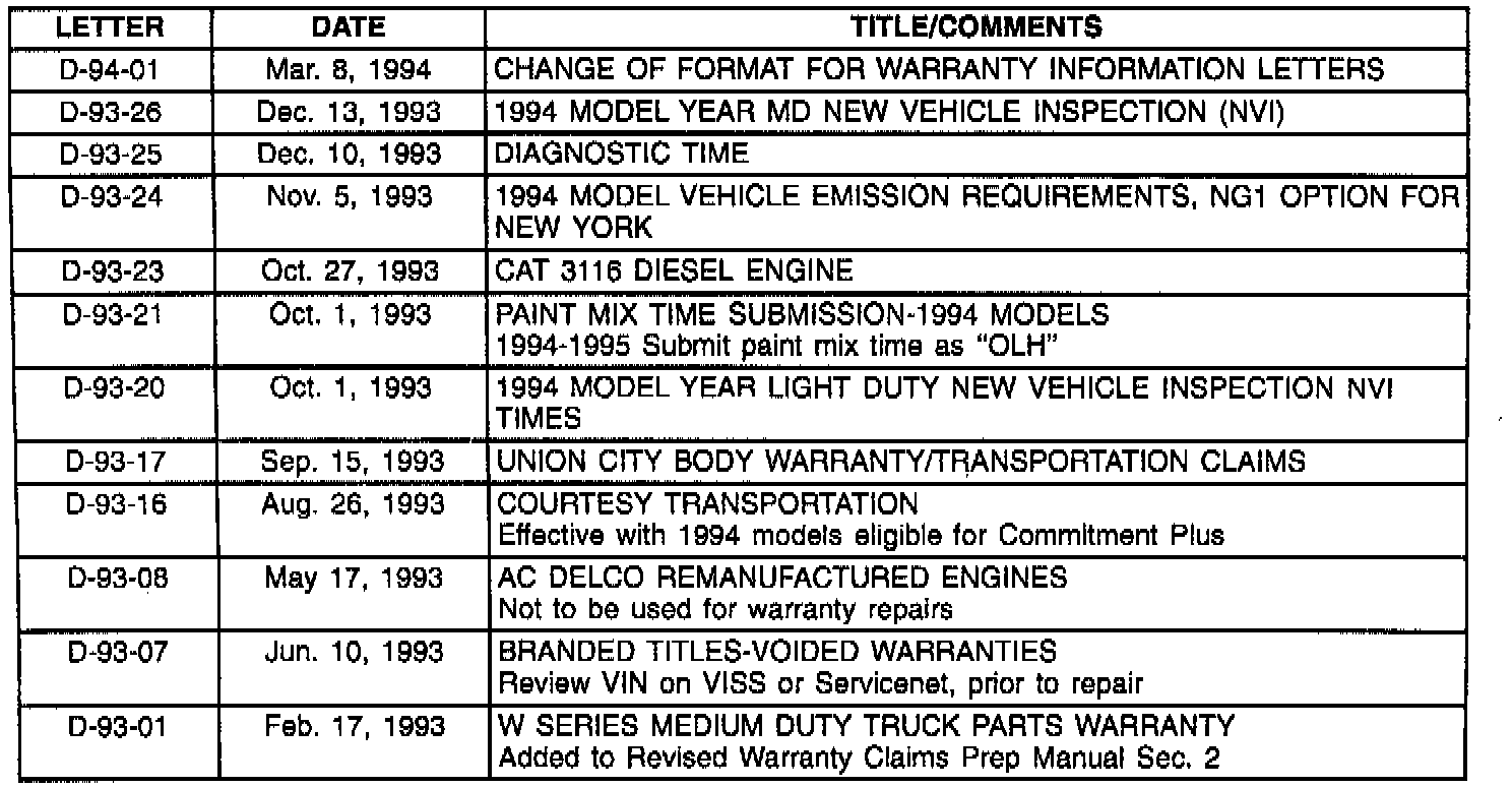 This bulletin provides an index of all GMC Truck previously issued "Warranty Information Letters". It is suggested that the appropriate dealership personnel be familiar with the subject and content of these letters. It is suggested that they be filed by number, behind the "Warranty Information Letter" tab in the GMC Warranty Claims Processing Manual (P9119Rev2/94). This index includes only those letters which are valid as of the date of this bulletin. With the formation of the GM common bulletin system, GMC now communicates important warranty information updates and changes through the "Warranty Administration Bulletins" (Corporate bulletin with a "teal" green banner). Dealerships are provided with an index of all corporate bulletins on a quarterly basis. Please review and file these bulletins also.
