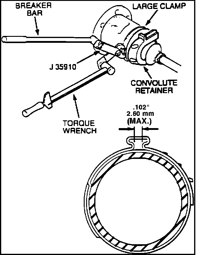 8. Secure the clamp with tool J35910, breaker bar and torque wrench. Torque small clamp to 136 N-m (100 lbs.ft.). Check clamp ear gap dimension (Figure 12).