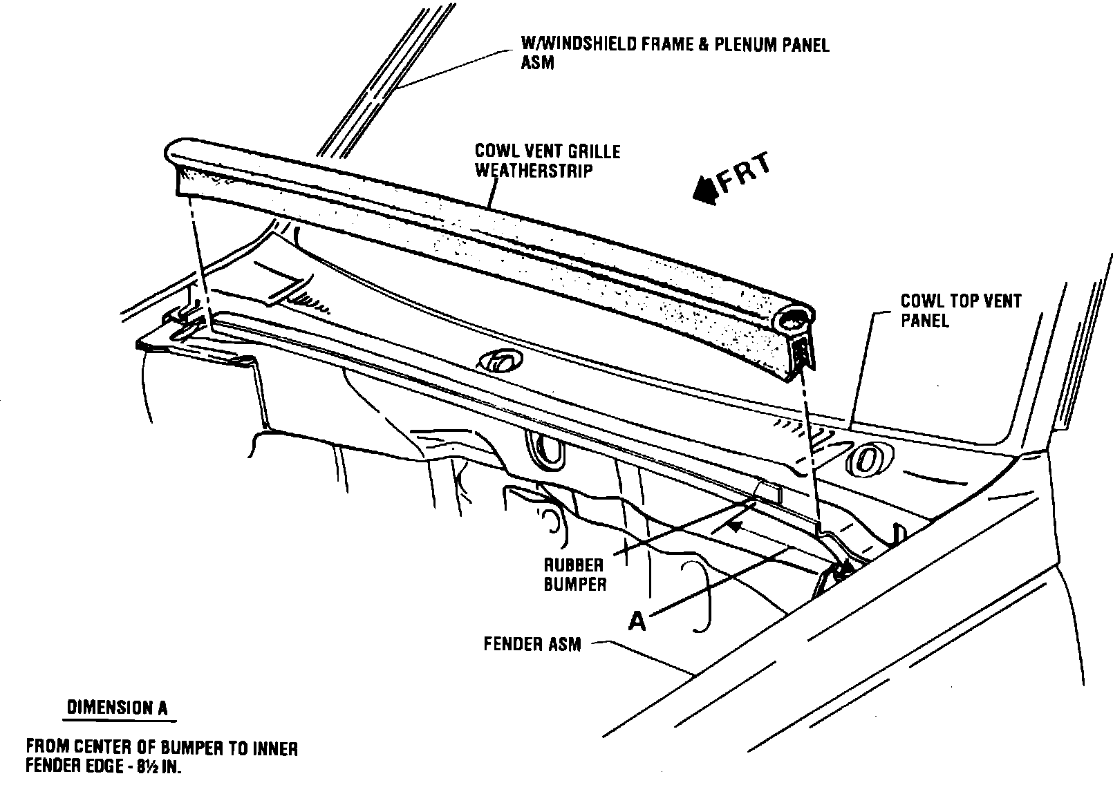2. Measure 8-1/2 inches along lower cowl panel from the inboard side of the front fenders as shown in Figure 1 dimension "A".