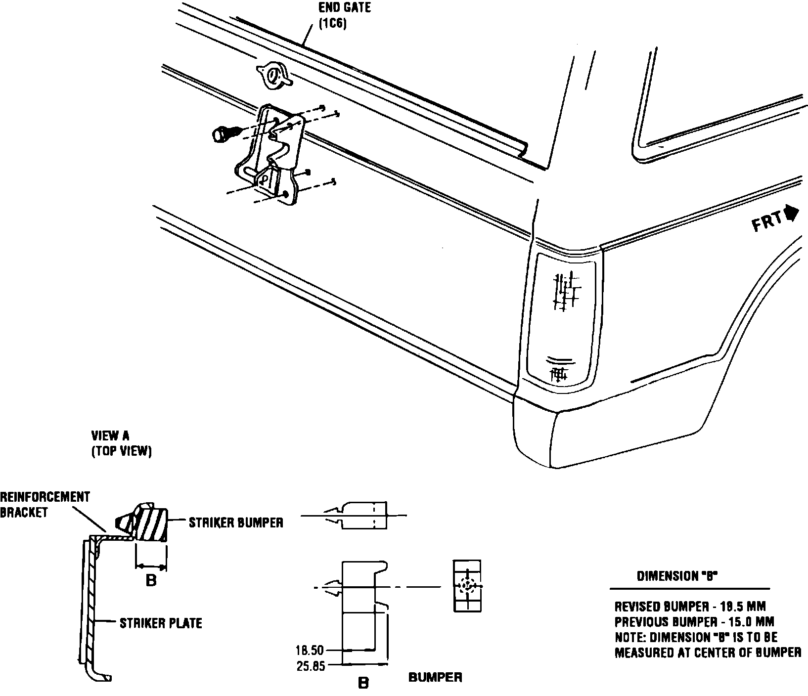 Before beginning this procedure, make sure that the spare tire carrier striker latch is double latched in order to assure that the following check is accurate. Grasp the carrier arm where the release handle is located and move the arm in a forward and backward direction relative to the vehicle. If a metallic sound is heard or if the arm moves easily then replace the striker plate with a new revised striker plate (P/N 15659235). This new striker plate has a thickened rubber bumper to reduce the movement of the carrier arm as well as an additional reinforcement bracket to absorb the additional force on the striker as a result of the thickened bumper. Old and new bumper sizes as well as the reinforcement bracket are shown in Figure 1.